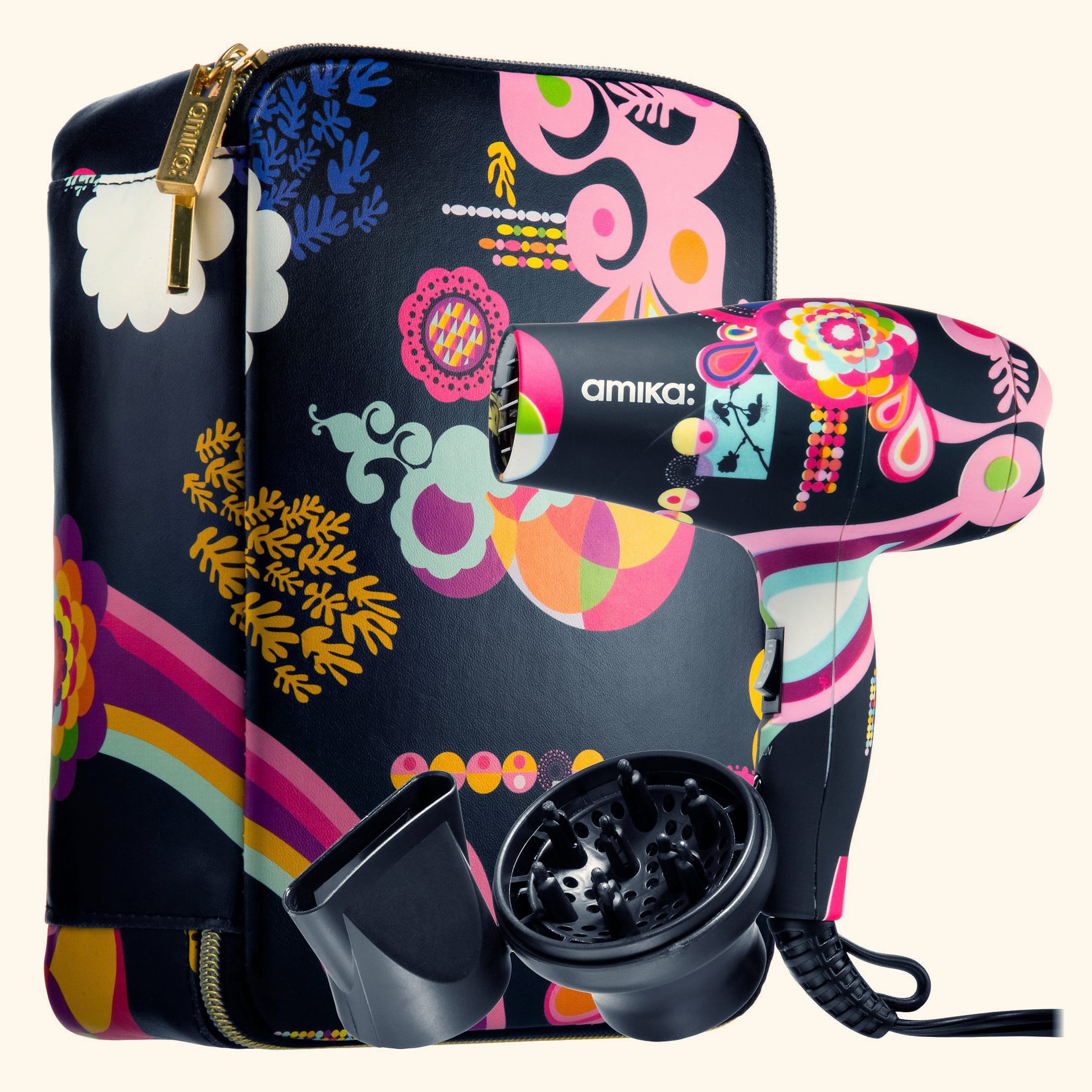 Amika mini komplet za oblikovanje pričesk krasi barvita torbica s futurističnimi motivi, v kateri sta skrbno shranjena sušilnik in ravnalnik za lase. Zaradi svojih majhnih dimenzij je komplet uporaben tako v bivalnih kot tudi javnih prostorih. Primeren je za potovanja ali vsakdanje nošenje.
