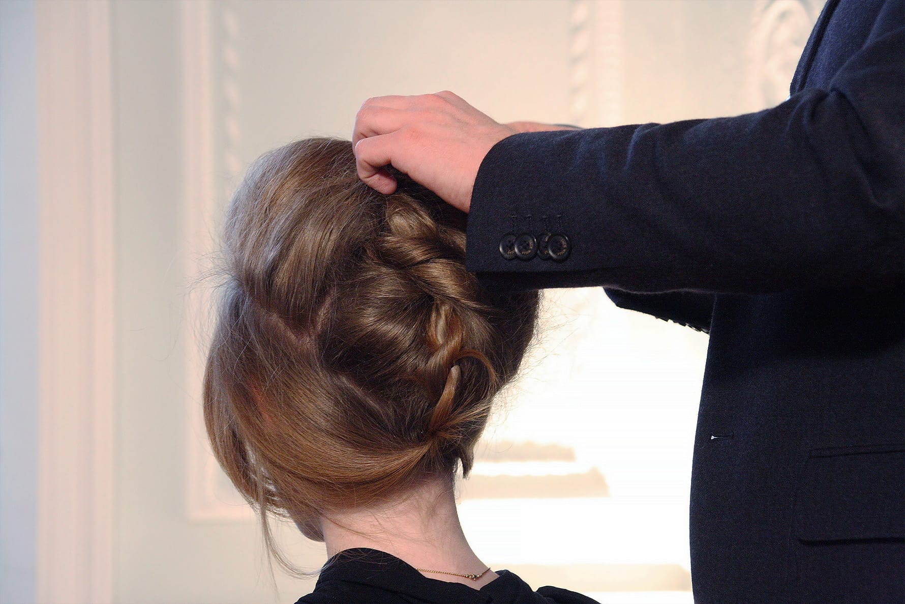 | zavihati, spodvihati konice, čop | tuck ends, a ponytail |
