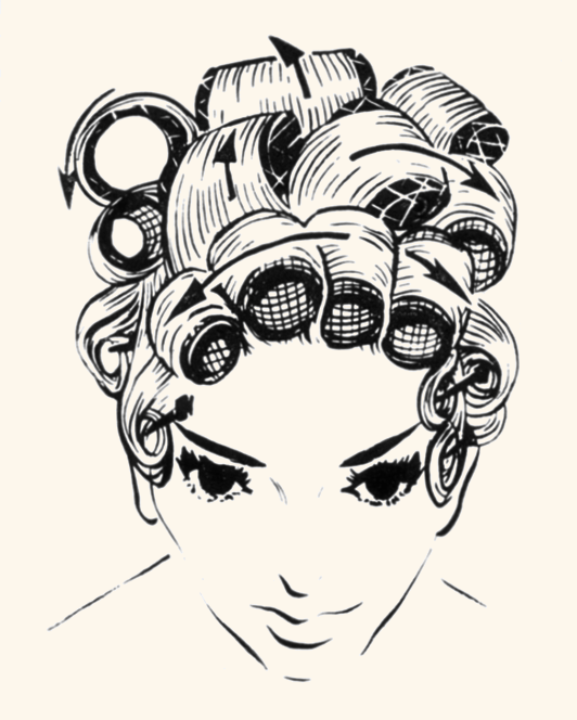 Sledi navijanje: na stranskih delih in vratu oblikujemo šestice – pramen las položen v obliki številke šest, pripet s ščipalko. Na risbah se lepo vidi, kako začešemo lase pri polaganju šestic. Smer navijanja je označena s puščicami.